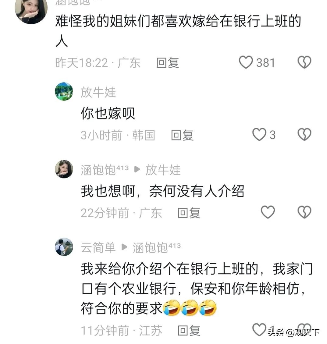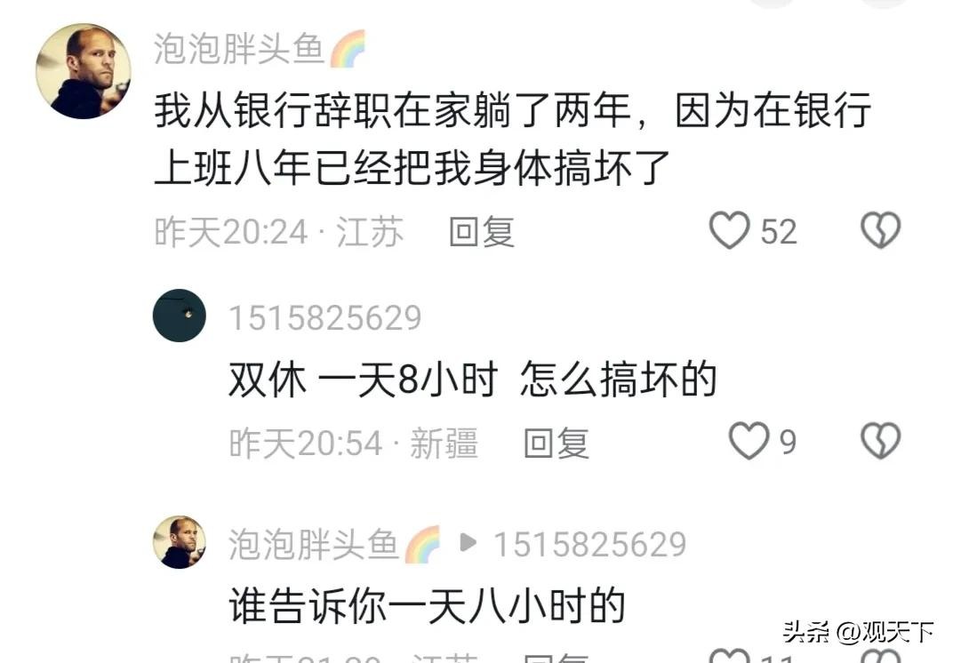 而有不少在银行上班的网友们现身说法:在银行上班确实工资更高一点点,但是压力也不是一般的大。各种揽储,贷款,推销信用卡的业务比比皆是。上级给的压力更是跟山一样重!给大伙的建议是纷纷劝退