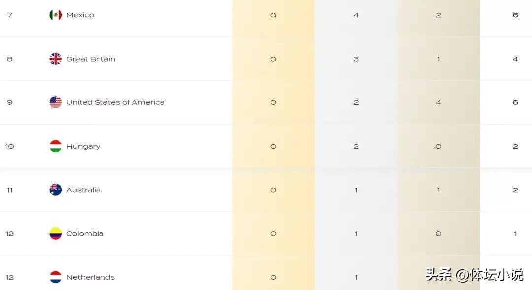 其他代表队日本依靠花样游泳上的强势夺下4金排名第二,德国依靠在公开水域上的强大统治力拿下4金排名第三,西班牙同样也是依靠花样游泳夺下三金排名第四,意大利依靠公开水域打破金牌荒,奥地利依靠花样游泳打破金牌荒,目前仅有6个国家拿到金牌,美国队暂时虽然没有金牌,但是一旦游泳项目开始后美国将疯狂冲击中国的榜首位置!