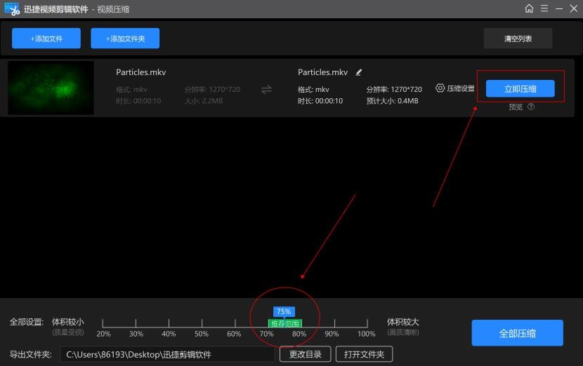 操作步骤三:上传好视频文件之后,就可以在【全部设置】一栏将压缩比设置到推荐范围之内。然后再点击【立即压缩】。