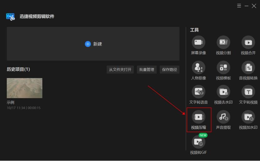 操作步骤一:将【迅捷视频剪辑软件】打开之后,就可以看到右侧有很多功能选项可供选择。接着找到【视频压缩】选项,然后点击进入压缩页面当中去。