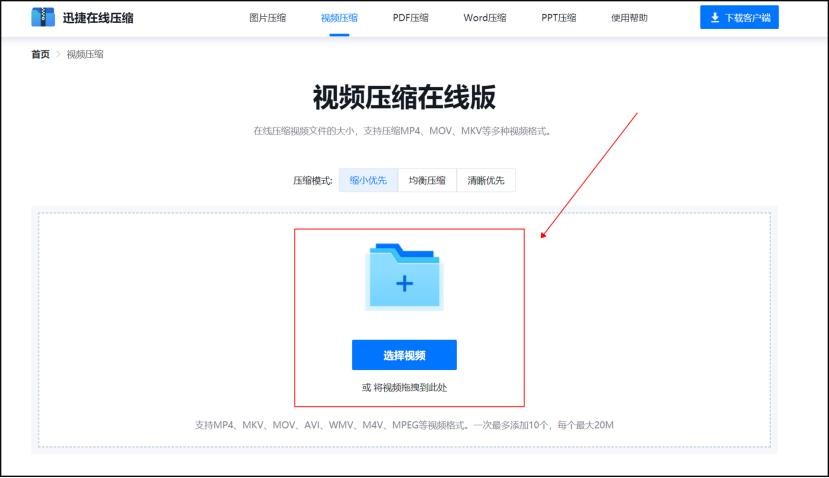 第一步:搜索进入【迅捷在线压缩】网站当中,接着点击【选择视频】将视频文件进行上传。
