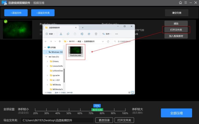 操作步骤四:当视频压缩完成之后,就可以点击【打开文件夹】。这样就能够在文件夹中找到压缩好的视频文件了。