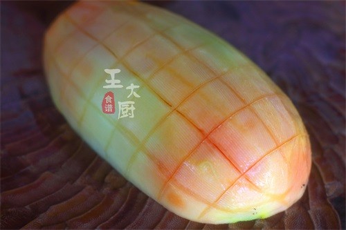 1、将整个的目光削皮之后,简单的冲洗一下,然后在表层上划出一道道的网格痕迹。
