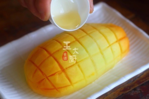 5、当木瓜蒸好之后,将蜂蜜淋在木瓜的表面。