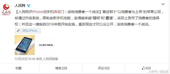 【人民网评iPhone旧手机降频门:该给消费者一个说法】曾经那个“以消费者为上帝”的苹果公司,却通过升级系统,限制老款手机性能,变得越来越“精明”和“霸道”,实际上剥夺了消费者的选择权;并且这一措施自2016年就开始实施,直到现在才对公众公开,该给消费者一个说法。