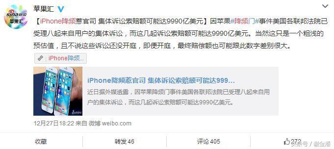【iPhone降频惹官司 集体诉讼索赔额可能达9990亿美元】因苹果#降频门#事件美国各联邦法院已受理八起来自用户的集体诉讼,而这几起诉讼索赔额可能达9990亿美元。当然这只是一个粗浅的预估值,且不说这些诉讼还没开庭,即便开庭,最终赔偿额也可能跟此数字差别很大。