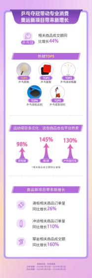 中国健儿的优异表现进一步掀起了大众体育运动热潮,乒乓球、羽毛球等销量显著增长。抖音电商数据显示,乒乓球相关商品成交额同比增长 44%,有助于提升技术水平和运动体验的乒乓底板、乒乓套胶等专业产品格外热销。羽毛球、排球、户外自行车相关商品的成交额同比增幅也分别达到了 98%、145% 和 130%。值得一提的是,本届奥运会的新项目也为大家带来了惊喜,15 岁的杨思琪代表中国冲浪首登奥运舞台,中国选手邓丽娟、伍鹏晋级速度攀岩决赛。新项目同样带来了新的消费增长,冲浪相关商品销售订单量同比增长 110%,攀岩相关商品成交额同比增长 160%。