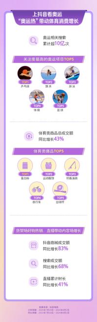 本届奥运会期间,有超 300 名中国代表团运动员在抖音分享训练备战、比赛生活以及奥运感言。7 月 20 日 -8 月 2 日," 奥运 " 相关搜索累计超 10 亿次,在抖音平均每天产生近 10 个 " 奥运 " 相关热点话题。# 全网寻找北京奥运同款背包 # 登上抖音热榜后,祥兴箱包紧急开播,首日便有超两百万人涌入直播间。中国队首金获得者黄玉婷同款幸运发卡也备受追捧,奥运赛场内外的持续火热,共同推动了体育消费市场的繁荣,也拉动了抖音电商货架场和内容场双增长。" 热力先锋季 " 主题活动期间数据显示,抖音商城成交额同比增长 83%,搜索成交额同比增长 68%;直播累计时长同比增长 41%,带动了内容场的增长。蛋白粉、运动服饰、钓鱼渔具、自行车和台球杆成为平台 " 爆款 " 商品。