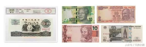 五国金砖纪念套装纸币包含:巴西纸币10雷亚尔1枚、俄罗斯纸币10卢布1枚、印度纸币10卢比1枚、南非纸币10兰特1枚、以及中华人民共和国第三套人民币10元大团结1枚。
