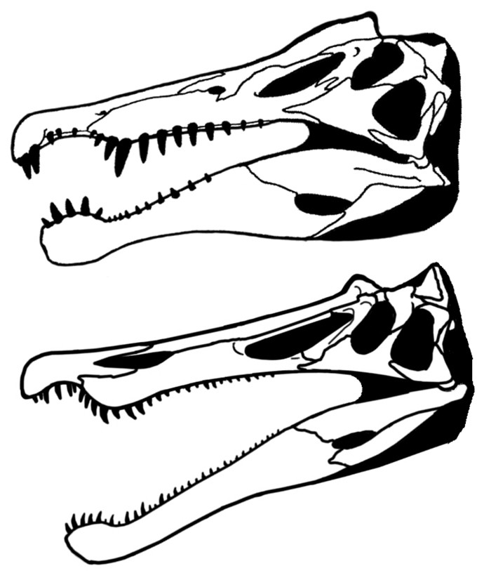 (图片说明:棘龙和重爪龙的头骨非常相似,意味着它可能也像后者一样有陆生恐龙的猎食习惯)
