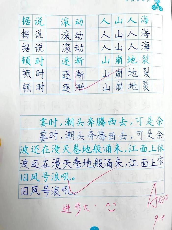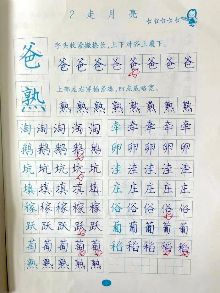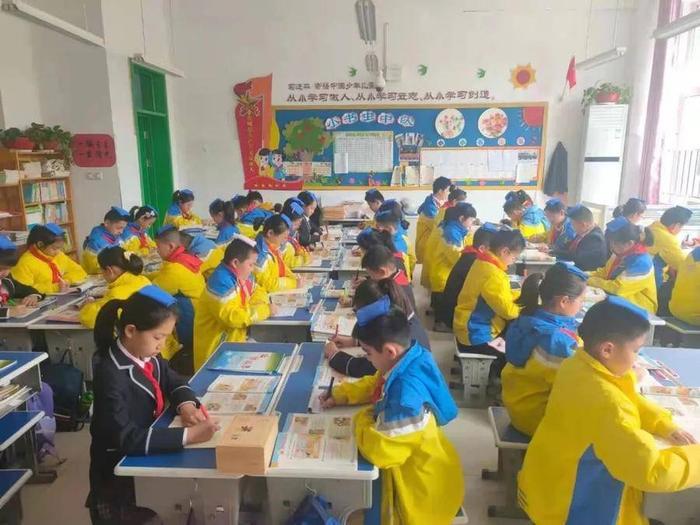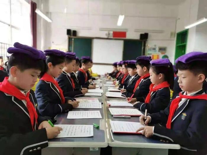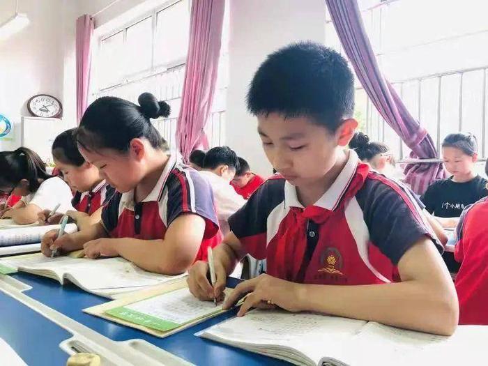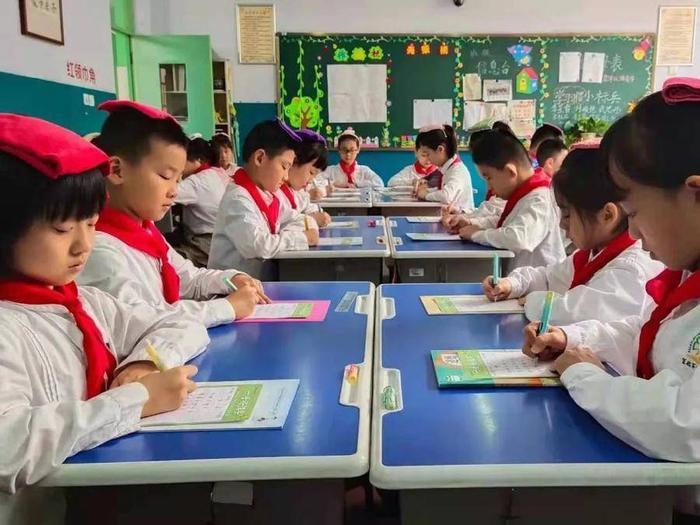 为了让学生端正写字姿势,每个学生都带来一块小方巾顶在头上,保证学生写字姿势端正,教师随时通过小口令等方式纠正学生不良姿势。每天中午两行字,写字练习不在数量多少,质量最重要。学校坚持从一笔一画入手,循序渐进,扎扎实实、力求实效。