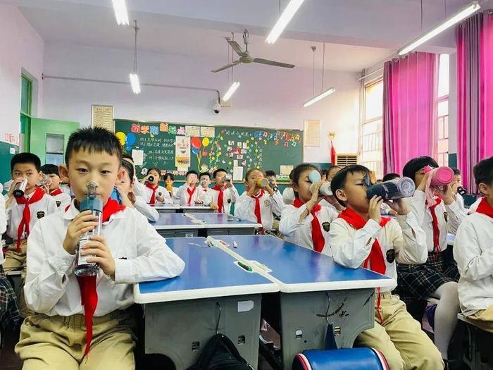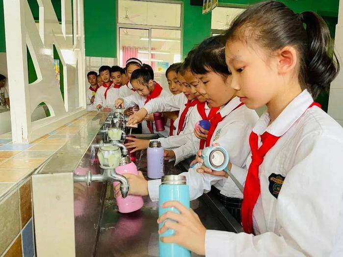 为增强学生体质,预防季节性流感,学校要求学生每个课间都要排队打水,有序喝水,保证每日在校最少五杯的喝水量。每位学生常备一只教室水壶,每个课间学生室外活动结束后,有序排队打水、排队喝水,班主任每天早晚两次打卡,上传学生喝水照片到学校群中,每周班主任例会都要对打卡情况进行通报反馈。学校服务中心每学期都会对学生饮用水水质进行检测,定期更换饮水机滤芯,确保学生喝好水、喝足水。