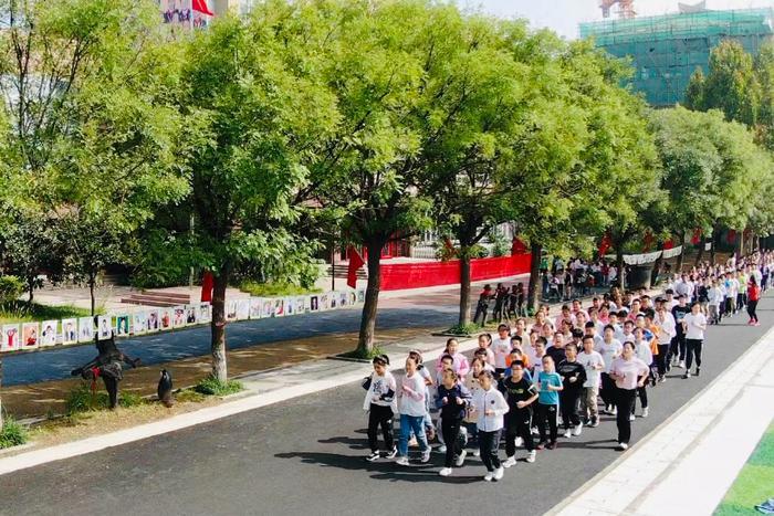 一个课间一个年级在尚美运动场上跑操三圈,这样算下来,每个学生每天可以跑一千米,一个月就可以跑两万米,一个学期下来,就能跑九十公里,相当于从浮来山到万平口的距离了!这样的活动量,学生脉搏、肺活量都能达到国家学生体质健康标准。每个课间,校园跑步的口号声此起彼伏,学生们能够通过这样的方式宣泄内心的情绪,学生走出教室,在每日千米中沐浴阳光,体育不仅仅是体能教育,更是一种心理健康教育。