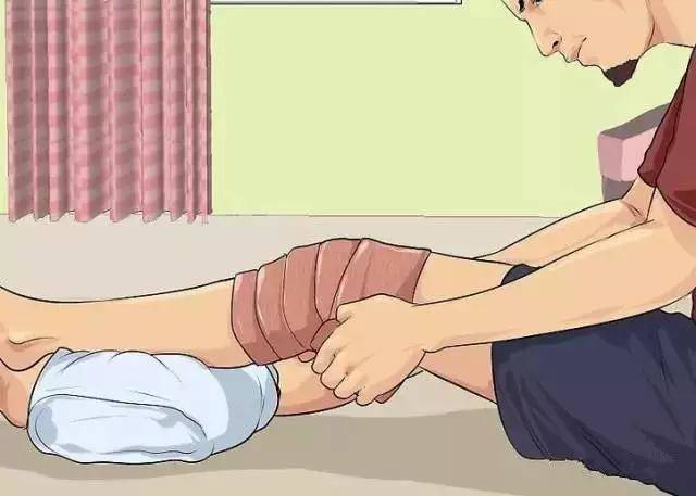 通过包扎或抬高伤处消除肿胀。在冰敷的间歇,可以用有弹性的绷带,对受伤肌肉进行加压包扎。加压包扎可以减缓血液流动,加快恢复复速度,但包扎不能过紧,会影响血液循环。