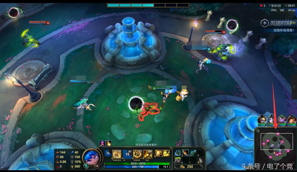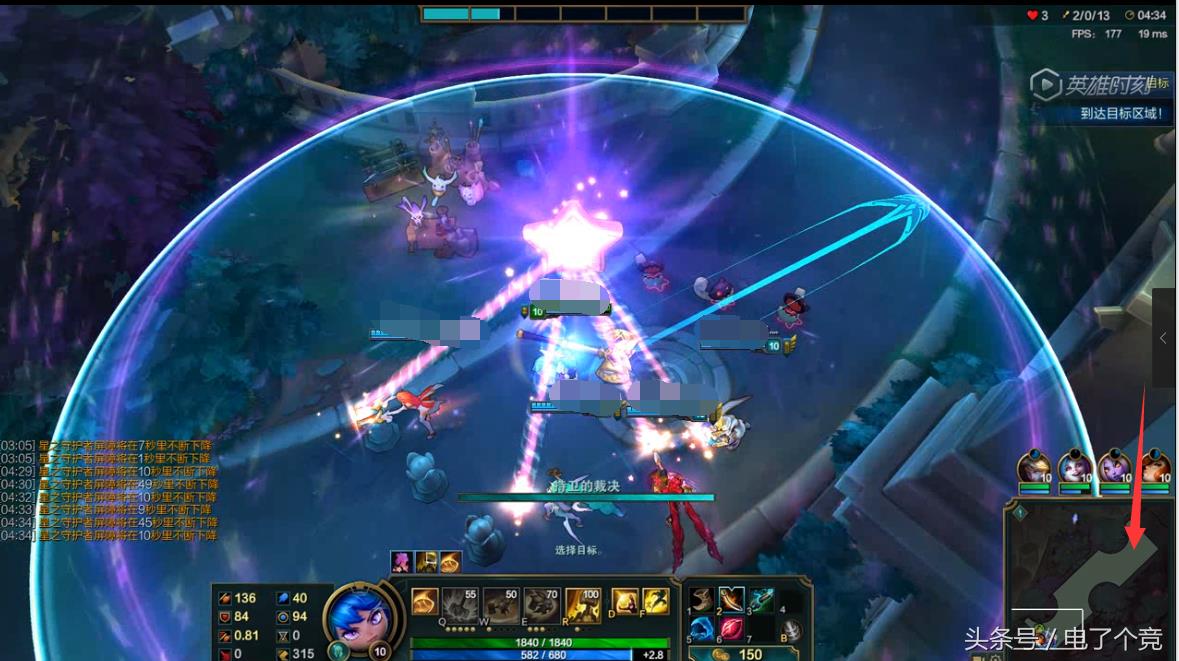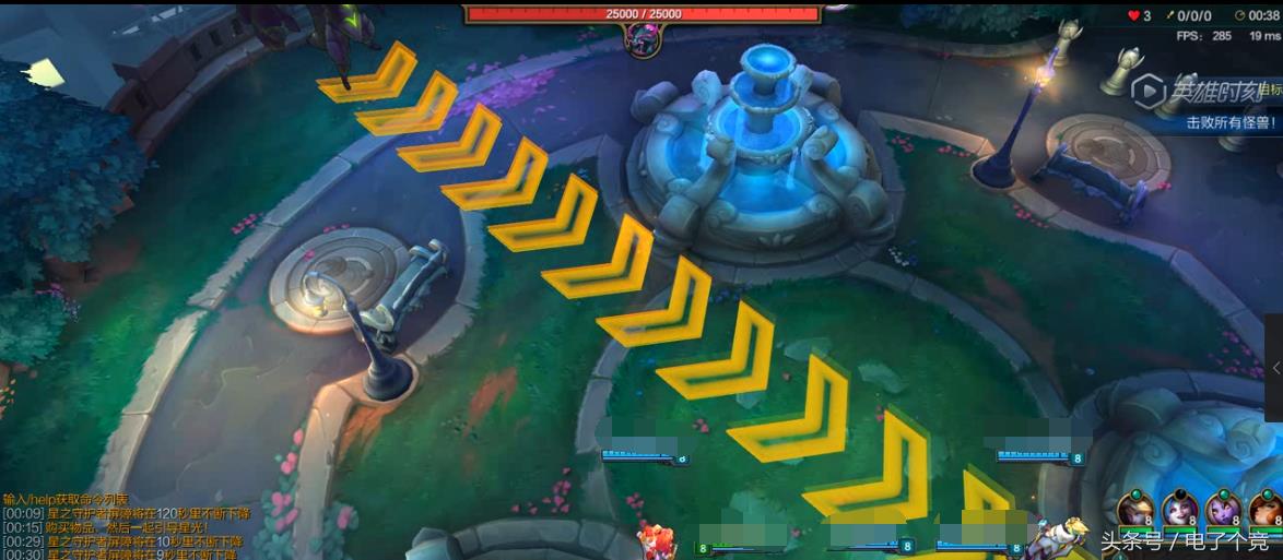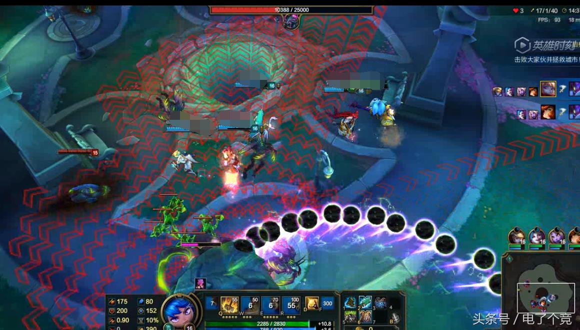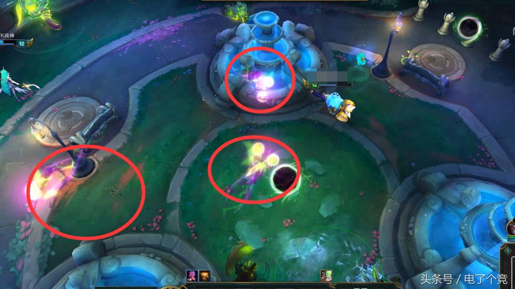 往箭头方向发射虚空发球。可被建筑物遮挡,小伙伴只要站在没箭头的地方就可以避开伤害,这个技能伤害贼高,迟到估计剩下1成血量。