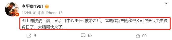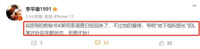 此前,李平康就在社媒上表示,在某项目主任被带走之后,G姓前体育总局局长的秘书也已经被带走,失联多日,大结局快来了。随后,李平康又再次更新了事件进展,G姓前局长的秘书已经结束调查回来了,但他的爱将L姓官员还处于失联状态,形势不妙。