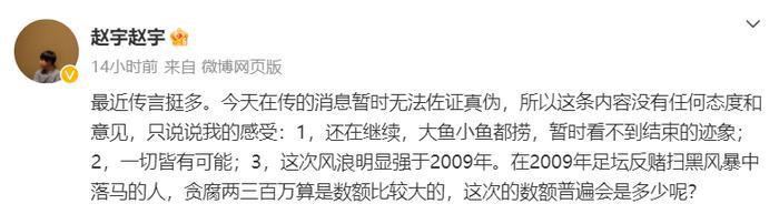 二国内记者赵宇也证实,体坛扫黑确实还在继续,大鱼小鱼都要落网,而且还看不到结束的迹象,而且,这次足坛扫黑的风浪明显比2009年更大,在上一次扫黑反腐中,贪腐两百万就属于金额比较大的了,这次普遍会是多少?