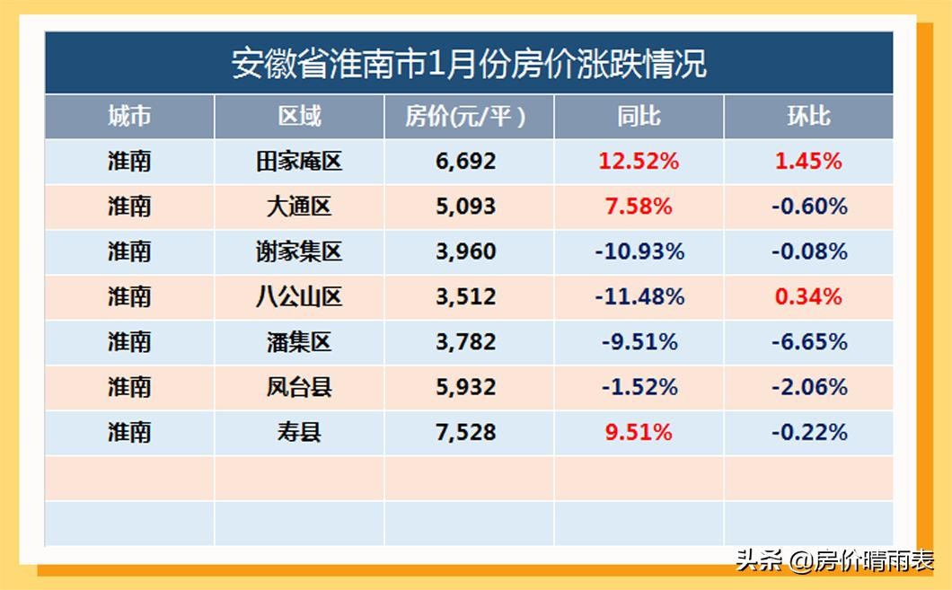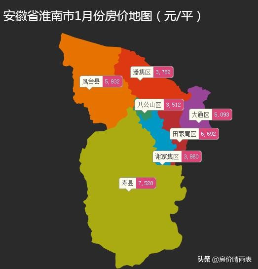 四线城市安徽省淮南市1月份各区县房价涨跌情况