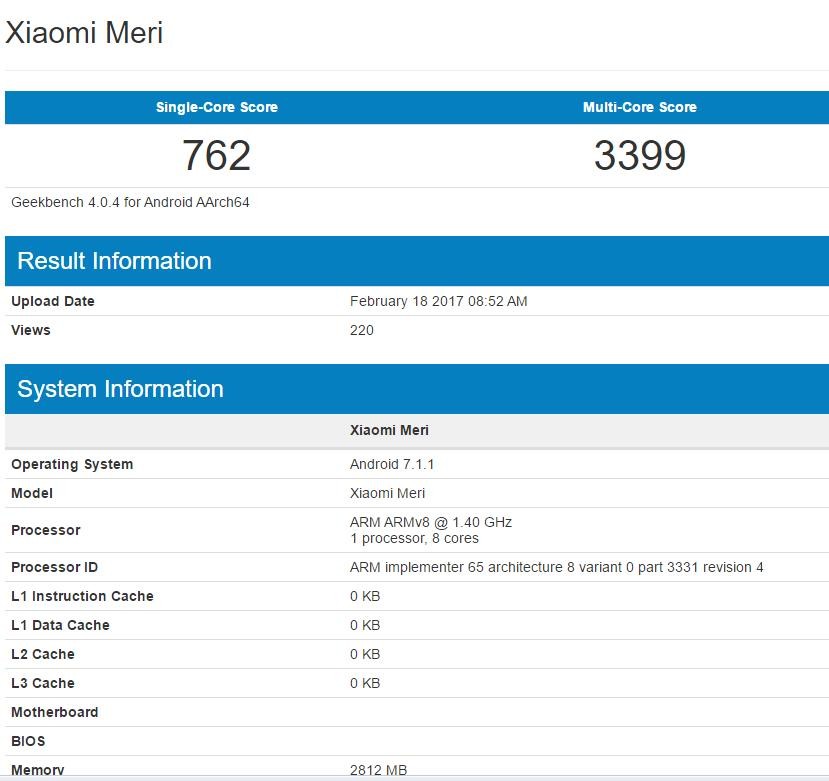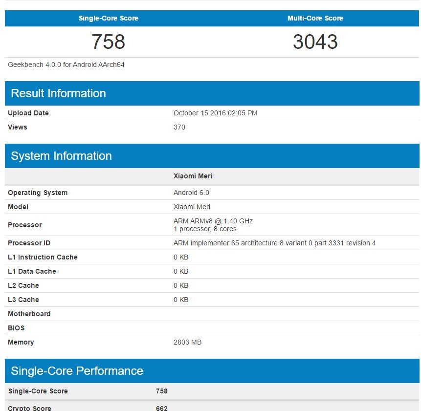 大家还记得之前曝光的一款代号为小米Meri的手机么,其实呢,小米Meri(又称小米5C),而这台小米手机Meri,采用了一块5.15寸或者是5.2寸的显示屏,产品的外观之前也曝光了不少,而且去年十月份也有曝光他的geekbench 4上的跑分信息。数据显示该机内置3GB运存,搭载主频为1.4GHz的八核处理器,预装Android 6.0系统,单线程跑分为758,多线程跑分为3043分。