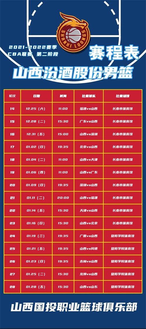 山西汾酒股份男篮2021-2022赛季CBA联赛第二阶段赛程