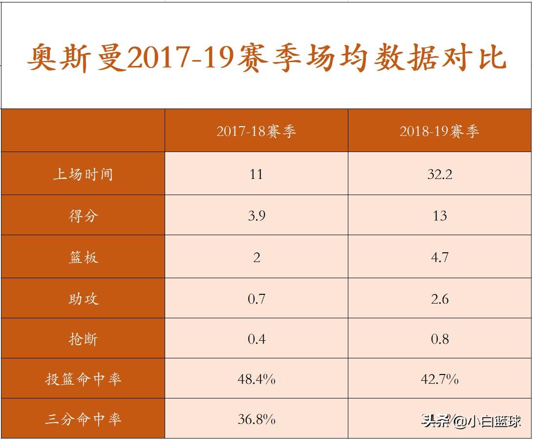 【奥斯曼2017-19赛季场均数据对比】