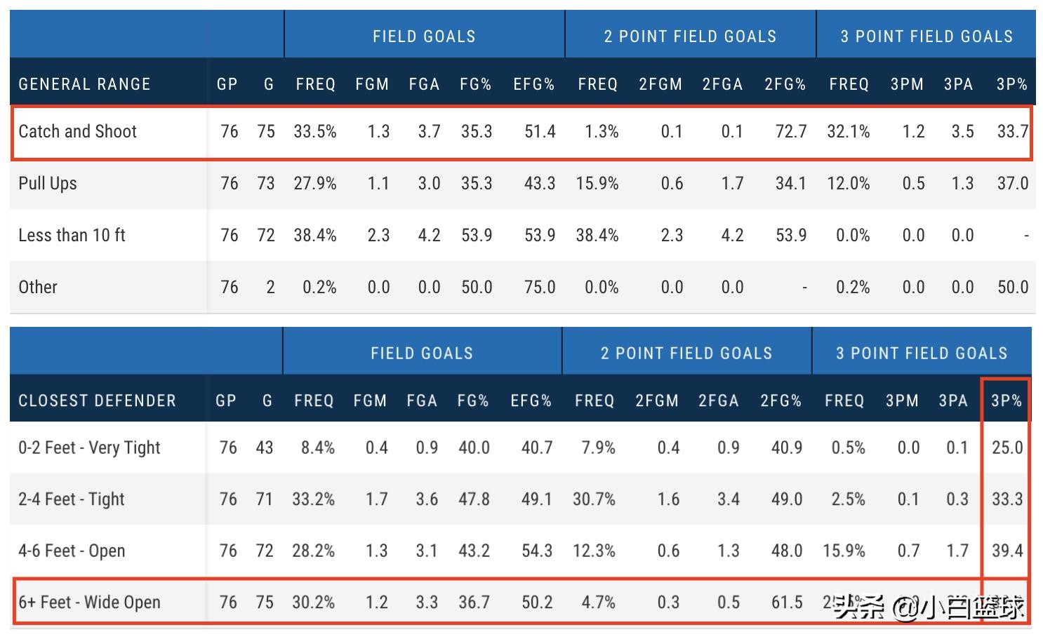 不过好消息是,本赛季至今小凯文-波特还是能在进攻端有所表现。这其中他在场均得到23.2分钟上场时间的情况下能得到10分3.2篮板和2.2中,虽然仅有33.5%的三分命中率并不算理想,但他却能在场均1.6次接球就投三分出手的情况下保持高达40.7%接球就投三分命中率的表现。
