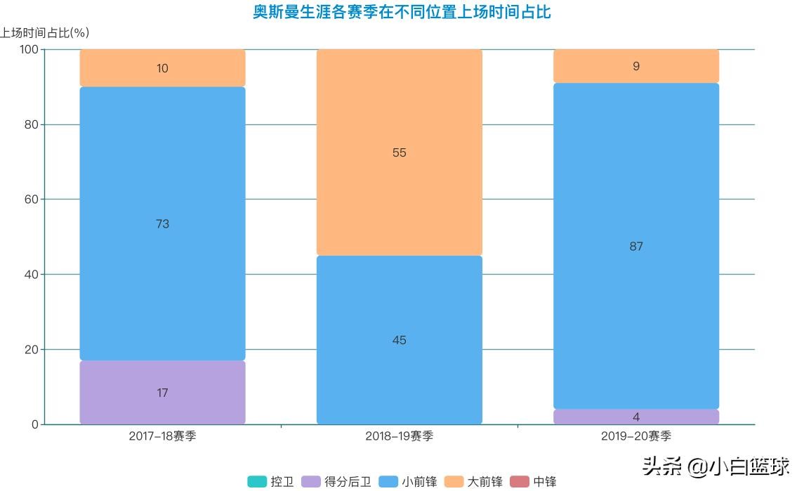 【奥斯曼生涯各赛季在不同位置上场时间占比】