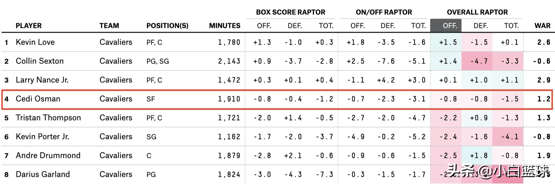 更何况,由于缺乏足够好的横移速度,赛迪-奥斯曼也无法在防守端有足够好的发挥,从防守RAPTOR这项数据上我们也能看到奥斯曼确实也无法给到骑士积极的贡献。