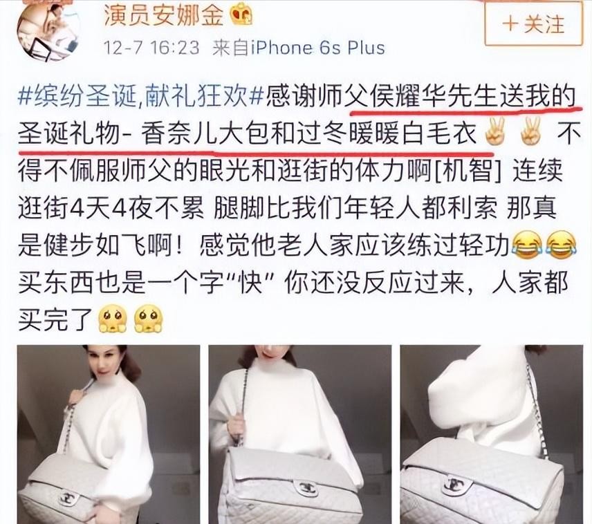 安娜金在网上晒出了一组照片,照片中她手提一款据说是侯耀华送的限量版香奈儿包包,满脸得意地配文:“孔夫子送给我的限量版香奈儿核头好看吗?”这一下,可把网友们给惊着了。要知道,限量版香奈儿可不是随便能送的,更何况是送给一个刚收不久的徒弟?
