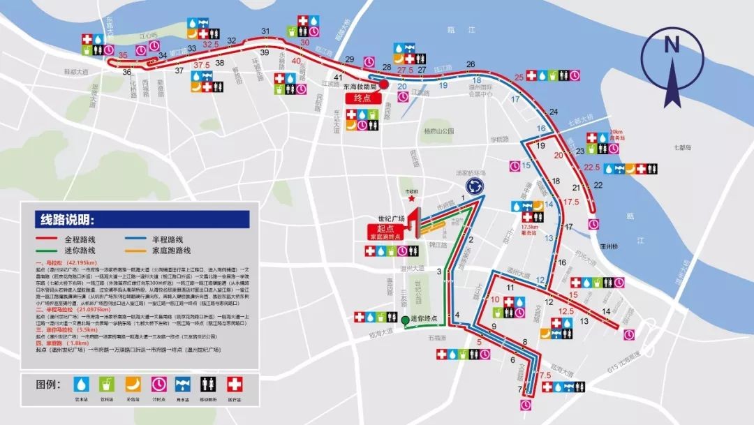 全程马拉松、半程马拉松、迷你马拉松和家庭跑的起点设置在世纪广场(市府路的府东路至府西路段),全程马拉松、半程马拉松的终点设置在惠民路(江滨路至瓯江路段),迷你马拉松终点设置在世纪公园中轴三友路(瓯海大道辅道至东垟路段),家庭跑终点设置在世纪广场(市府路的府东路至府西路段)。