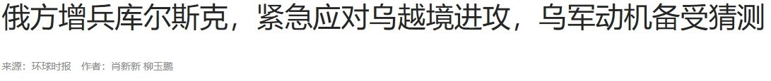 环球时报:2024-8-10:俄方增兵库尔斯克,紧急应对乌越境进攻,乌军动机备受猜测