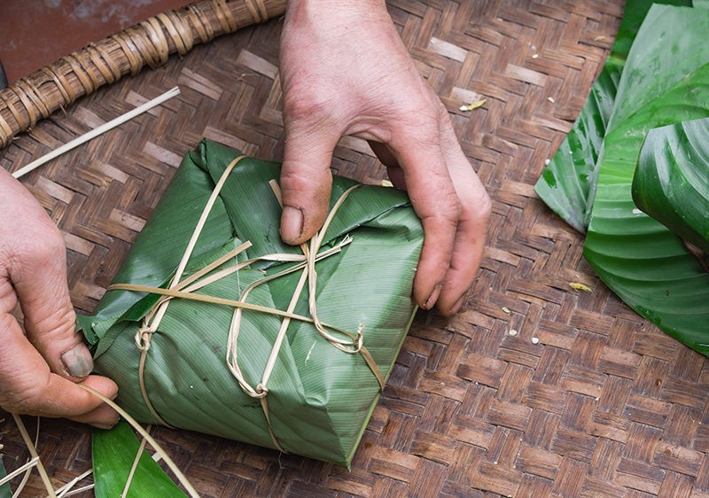 过去,许多越南人会在自己的花园里种植并照料自己的树木。随着城市化的迅速发展,大城市的人们越来越难以照看植物。许多家庭通过在家乡保留一棵树,并支付费用让人在一年内照料它,以保持这一传统。当Tết到来时,他们会在最后一个农历月的26日左右将树带回城市,并在tết的第五天将其带回。其他的Tết装饰包括盛满成熟水果的碗、代表长寿的黄色花朵、老式的画作和古越南谚语的书法。在越南南部,一些文化通过将上述元素固定在竹竿上来创造他们自己的Tết树。如果你在河内的老城区或胡志明市市中心,你可能会看到街头摊位上摆满了红色和黄色的纸质祭品、书法和花朵,为新年做准备。第5天:包裹Banh Chung——Gói Bánh Chưng(2023年1月18日)Banh Chung是用柊葉包裹的,这让Banh Chung呈现绿色。