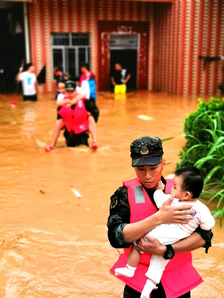 2020年6月8日,广东清远源潭镇莲安村,武警官兵在转移被困群众。/图:VCG