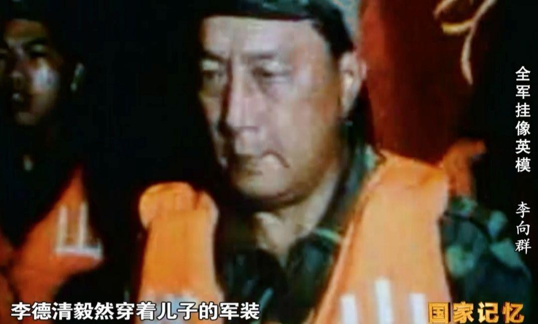 李向群牺牲后,他的父亲李德清穿着儿子的军装,加入了巡堤抢险的队伍。