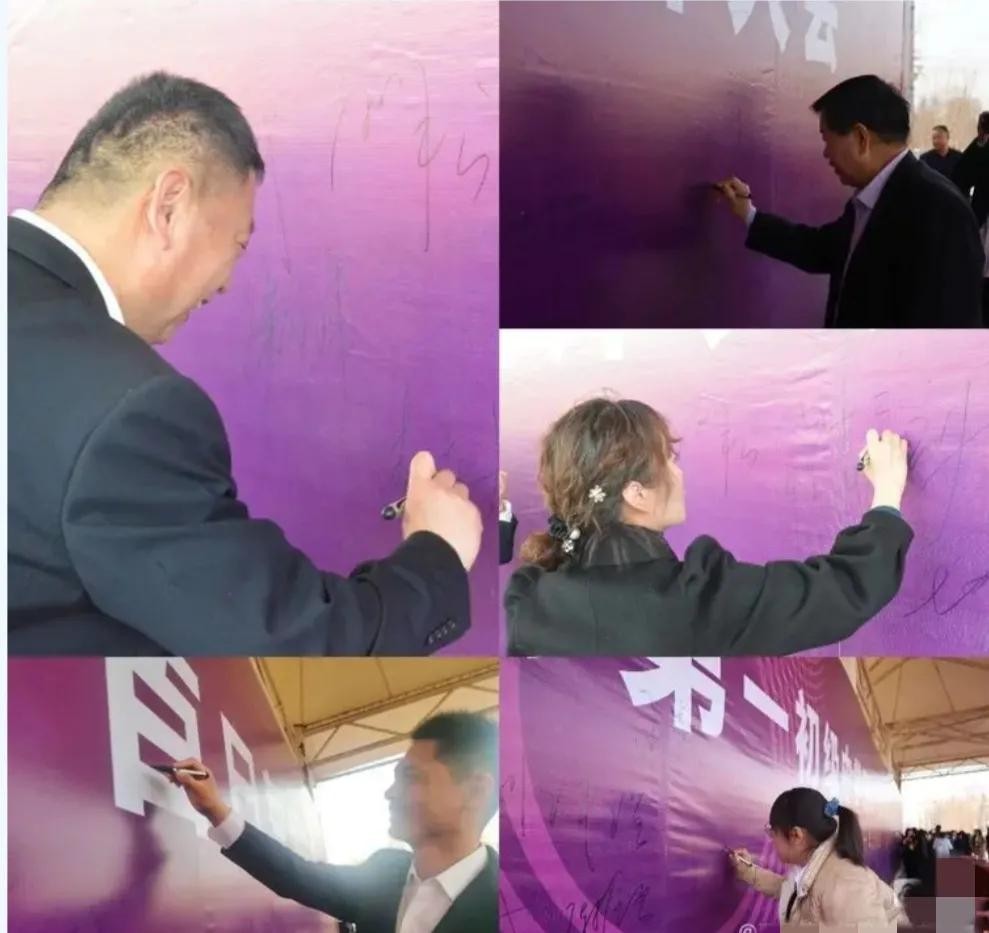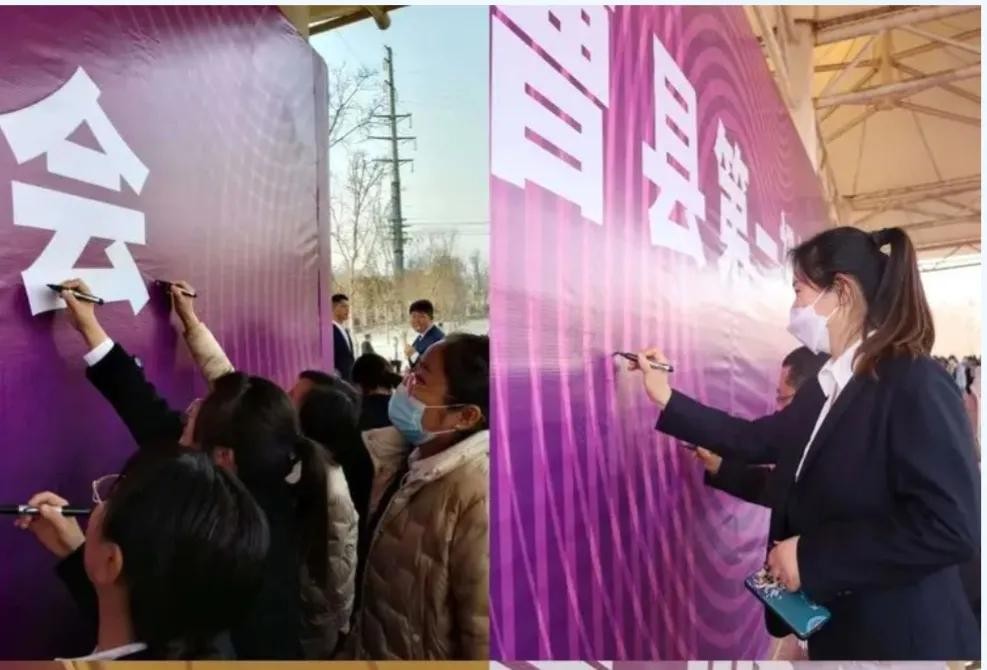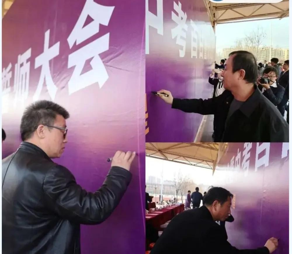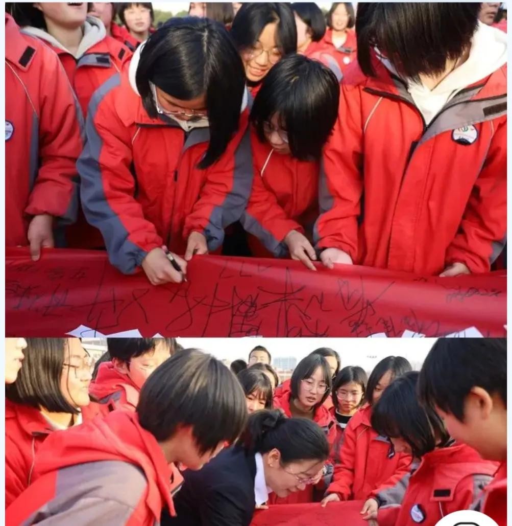活动结束后,主席台上的领导和老师们共同在背景墙上签名留念,写下对一初的祝福;台下的同学们在“中考签名条幅”签名明志。“大鹏一日同风起,扶摇直上九万里”,初三学子的每一个名字都承载着梦想,承载着铮铮誓言。他们在红色条幅上签下他们的名字,许下诺言,践行誓约,相信这一刻的时光将在他们的人生中永远被铭记。