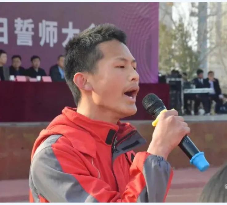 初三·五班甄招然同学带领全体初三同学宣誓,让我们拼搏,用行动实现青春的诺言;让我们努力,用汗水浇灌理想的花蕾,奋战百日,让七彩的梦在六月放飞!