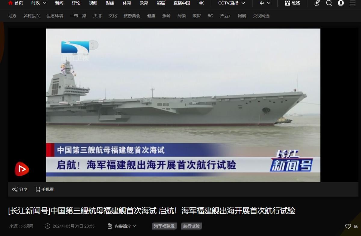 信息来源:央视网2024-5-1 长江新闻号 中国第三艘航母福建舰首次海试 启航!海军福建舰出海开展首次航行试验