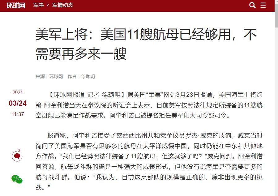 信息来源:环球网2021-3-24 美军上将:美国11艘航母已经够用,不需要再多来一艘