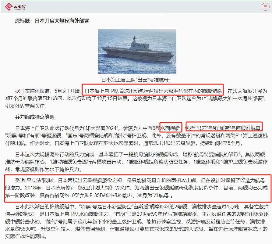 根据2024年5月的消息,日本进行海外部署的时候, 就启用了两艘航母。