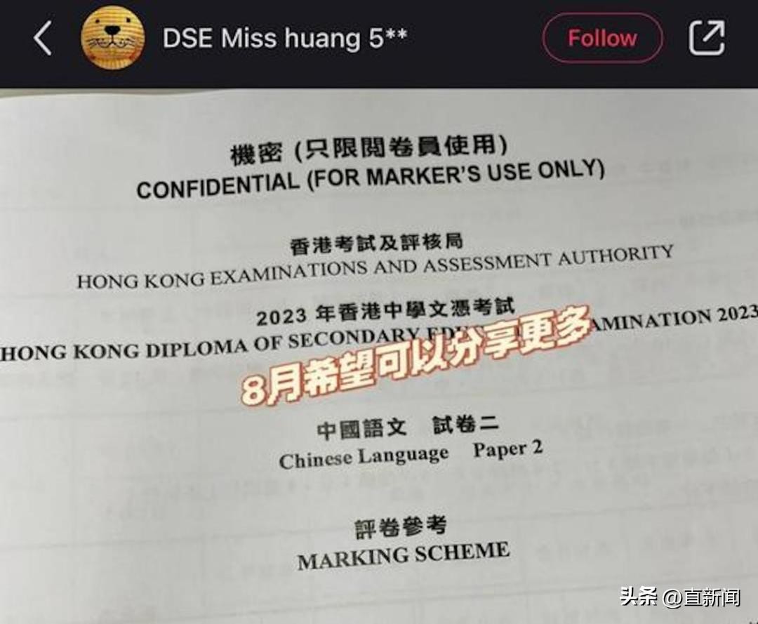 据香港“点新闻”报道,近日内地社交平台“小红书”有一名自称为“中文科阅卷员”的“DSE 5**王老师”用户,公开一份写有2023年DSE(全称香港中学文凭试,俗称“香港高考”)“机密(只限阅卷员使用)”的批改参考文件。香港考评局18日曾表示,相关事件属于严重违反守则,已报警交由警方处理。考评局强调,有要求考务人员保密协议,而且协议没有时限,相关人员须严格执行。警方昨日(21日)拘捕一名男子,涉嫌违反《香港考试及评核局条例》。
