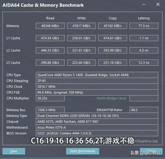 如果再继续压一下时序,可以达到C16 19 16 16 36 56,能过AIDA64稳定性测试但吃鸡会死机或闪退。