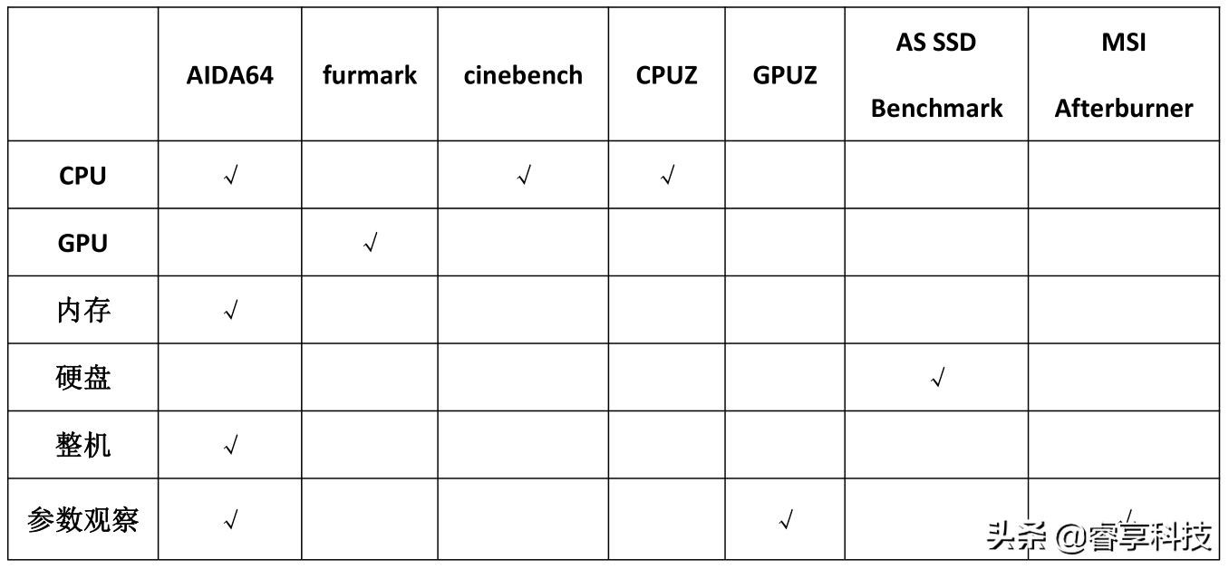 本次用到的测试软件有AIDA64、furmark、cinebench、CPUZ、GPUZ、MSI Afterburner、AS_SSD_Benchmark(需空盘测试、本次参数仅作参考)等,如下图所示: