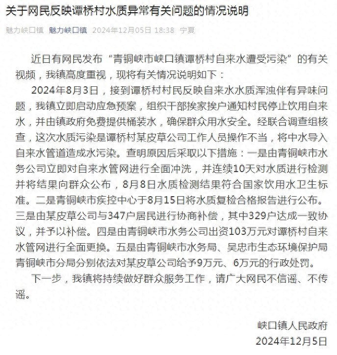近日有网民发布“青铜峡市峡口镇谭桥村自来水遭受污染”的有关视频,宁夏吴忠青铜峡市峡口镇人民政府12月5日发布情况说明,2024年8月3日,接到谭桥村村民反映自来水水质浑浊伴有异味问题,峡口镇立即启动应急预案,组织干部挨家挨户通知村民停止饮用自来水,并由镇政府免费提供桶装水,确保群众用水安全。经联合调查组核查,这次水质污染是谭桥村某皮草公司工作人员操作不当,将中水导入自来水管道造成水污染。