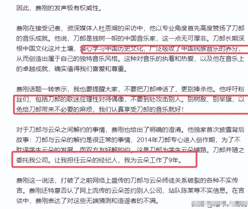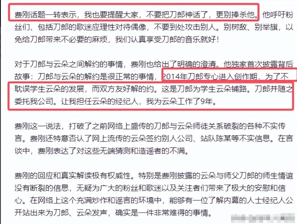 就在这些流言四起、真相扑朔迷离的时候,刀郎和云朵的前经纪人费刚站出来,亲自为两人澄清了事情的真相。费刚表示,关于刀郎与云朵解约、师徒情谊破裂的传闻完全是无稽之谈。