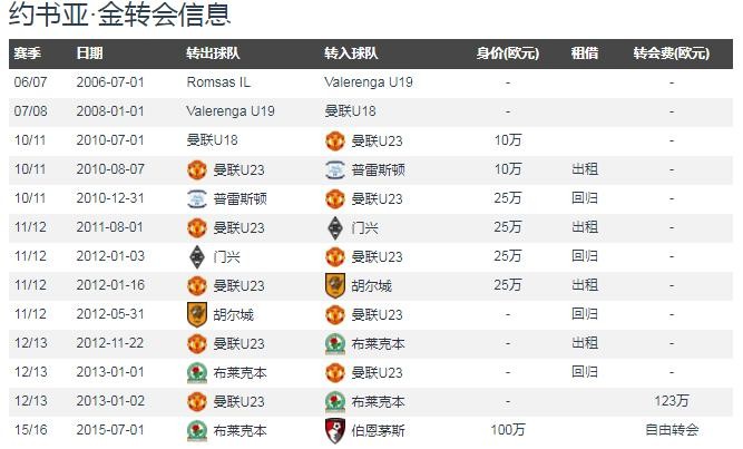 约书亚·金为转会曼联俱乐部之后,仅仅出场过一次,在2013年1月转会布莱克本,2015年以自由球员的身份加盟伯恩茅斯。