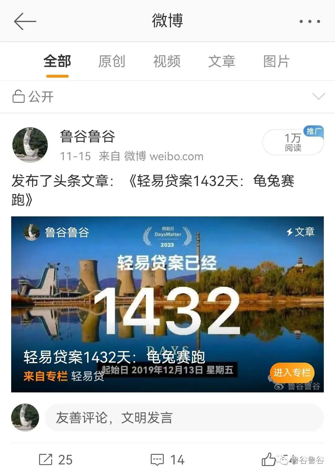 微博上龟兔赛跑这篇,竟然成功发出来了,然后竟然被李大善人ZZ转发了,效果就不一样了,微博阅读1万,文章阅读6000多,快赶上李大善人ZZ上一篇的零头了。