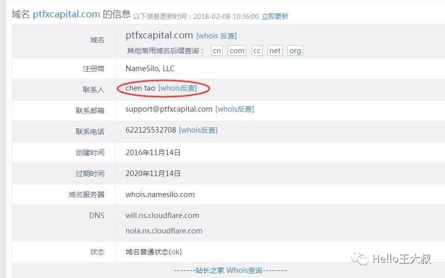 PTFX跟单 www.ptfxcapital.com,注册时间为2016年11月15日,网站服务器在美国,域名在国内备了案,公司名称为上海稷噬电子科技有限公司,法人代表为陈涛(whois反查,此人名下有2212个域名,带截图)。