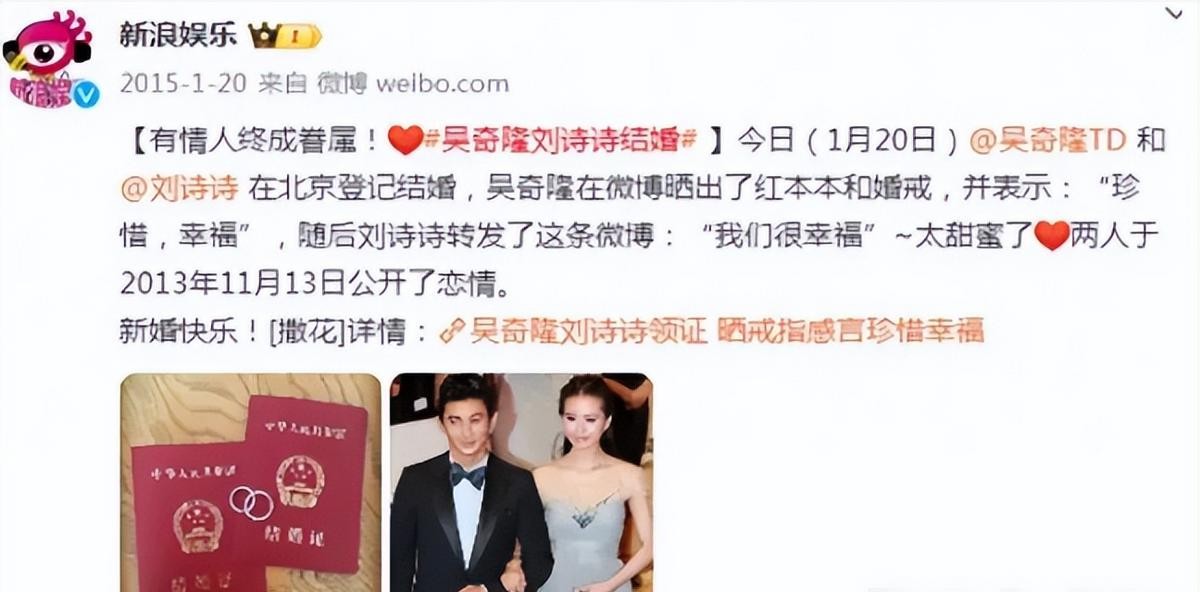 2015年,他们步入婚姻殿堂时,吴奇隆晒出了一张他们领取结婚证的照片,还写下了八个字来夸自己的幸福:“珍惜一切,简单幸福。