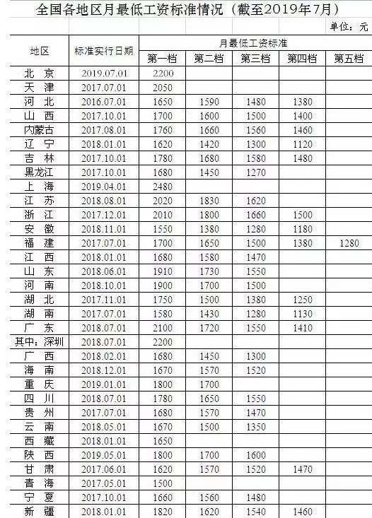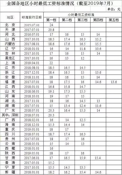 截至2019年7月,北京、上海、重庆、陕西已调整2019年最低工资标准。这是目前最新的全国各地最低工资标准表格。