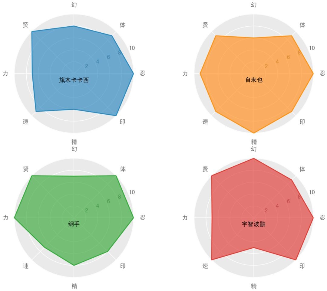 abilities = [ 忍 , 体 , 幻 , 贤 , 力 , 速 , 精 , 印 ] super_heros= { 旗木卡卡西 : [10, 9, 8, 10, 7, 9, 6, 10], 自来也 : [10, 9, 6, 9, 9, 9, 10, 9], 纲手 : [10, 10, 7, 10, 10, 7, 8, 8], 宇智波鼬 : [10, 9, 10, 10, 7, 10, 5, 10], } generate_ability_map(abilities,super_heros, 2)